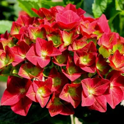 Гортензия Грин шадоу описание которой впечатляет, знаменита своим уникальным двухцветным цветением. Соцветия крупные, длиной до 15 см. Основная окраска цветков – малиновая, с четко выраженными зелёными тенями по краям ромбических лепестков. Эта особенность придает соцветиям особую рельефность и глубину цвета. Цветение начинается рано, с июня и продолжается очень обильно до самого октября. Листва ярко-зелёная, продолговатой формы с зубчатым краем.