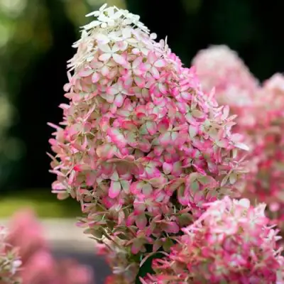 Гортензия метельчатая Роял Фловер описание которой часто акцентирует внимание на уникальной окраске, поражает воображение своими крупными соцветиями-метелками диаметром 20–25 см. В начале сезона цветки имеют ослепительно белую окраску, придающую саду свежесть и легкость. Однако к концу вегетации на чашелистиках проявляется широкая ярко-розовая кайма невероятно красивого оттенка, в то время как серединка соцветия остается контрастной бело-зеленой. Цветение начинается в июле и продолжается до конца сентября, сопровождая садовое пространство легким и нежным ароматом.