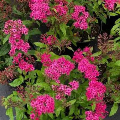 Спирея радует глаз крупными щитковидными соцветиями, размер которых может достигать 15 см. Цветы карминного цвета с слабым ароматом обильно цветут с конца июня до сентября, образуя великолепный контраст с зелеными и желтыми прожилками на листьях. Это особенно впечатляющее зрелище, которое преобразит ваш сад и привлечет внимание всех прохожих.