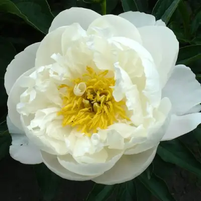 Цветки у пионов 'Мадрид' крупные, диаметром около 10 см. Их полумахровая структура придает цветкам особое очарование. Белые, широкие лепестки нежной текстуры обрамлены ободком из белых тычинок, создавая неповторимый центральный диск. Нежный аромат добавляет дополнительную нотку романтики и утонченности.