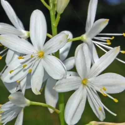 Многолетник, происходящий из Европы, растёт компактно, формируя прикорневую розетку из узких желобчатых листьев. Высота растения — от 30 до 50 см. Листва насыщенно-зелёная, с едва заметным сизым налётом. Цветоносы прямые, безлистные, образуют разветвлённые метёлки, на которых раскрываются белые звёздчатые цветки. Диаметр каждого — около 1,5 см. Цвет лепестков — холодно-белый, пыльники ярко-жёлтые, что создаёт выразительный контраст.