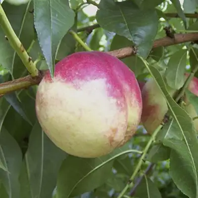 Плод имеет гладкую, блестящую кожицу, что является характерной чертой нектаринов. Светлый фон кожуры покрыт легким румянцем, что делает его не только вкусным, но и красивым.