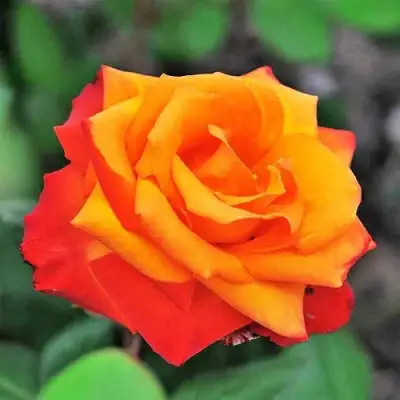 Цветки — одиночные, диаметром 8–10 см, правильной бокаловидной формы. В стадии роспуска лепестки образуют плотную розетку, не теряя очертаний. Основной тон — насыщенный красно-оранжевый с лимонным подтоном, который особенно выразителен на фоне плотной глянцевой листвы. Цвет не выгорает, а структура лепестков остаётся чёткой даже при перепадах погоды. Махровость умеренная, до 25 лепестков.