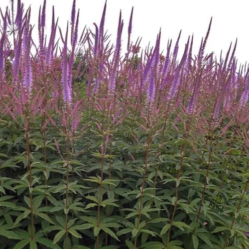 Листья тёмно-зелёные, узкие, собраны в мутовки. Такое расположение подчёркивает графичность и придаёт растению скульптурность даже вне периода цветения. Цветение начинается в июле и продолжается до конца августа. Соцветия длиной до 20–30 см, густые, прямостоячие, лилово-розового оттенка. Цветки мелкие, но многочисленные, распускаются постепенно, создавая эффект «живой волны». Аромат отсутствует — можно смело размещать рядом с пряными или душистыми культурами.